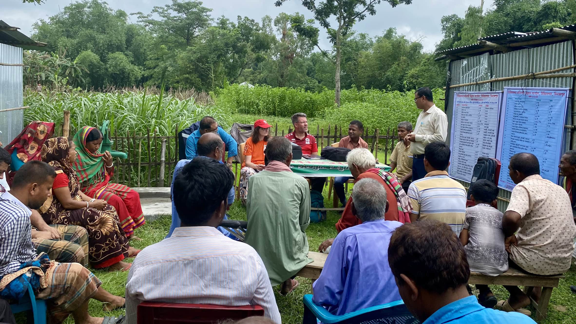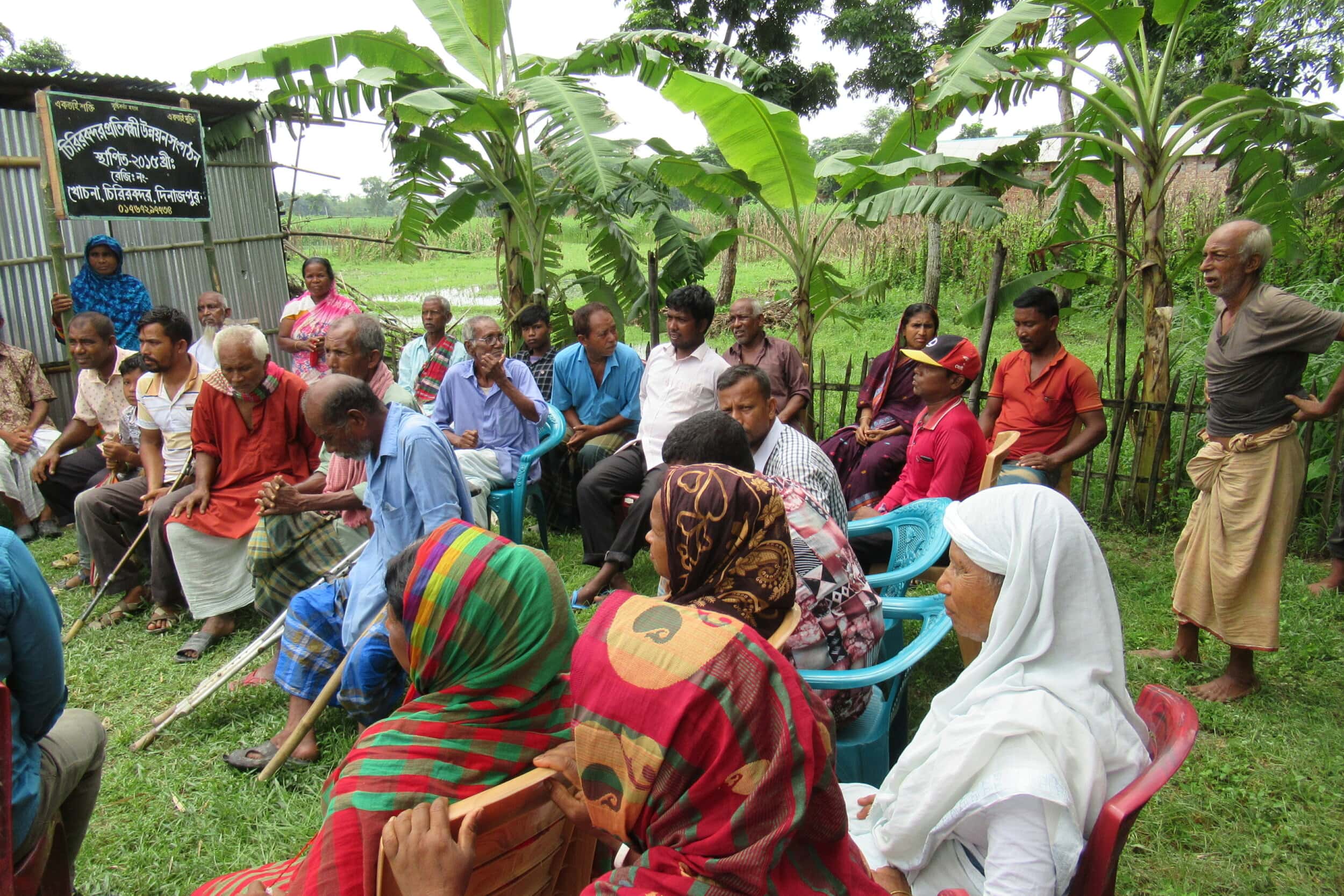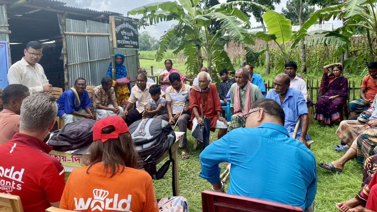 Als we aankomen in Chirirbandar, wordt er even overlegd. Gaan we binnen zitten in het kleine, golfplaten gebouw, of liever in de buitenlucht? Toch maar buiten, waar meer ruimte is voor de 35 mensen die zich verzameld hebben.