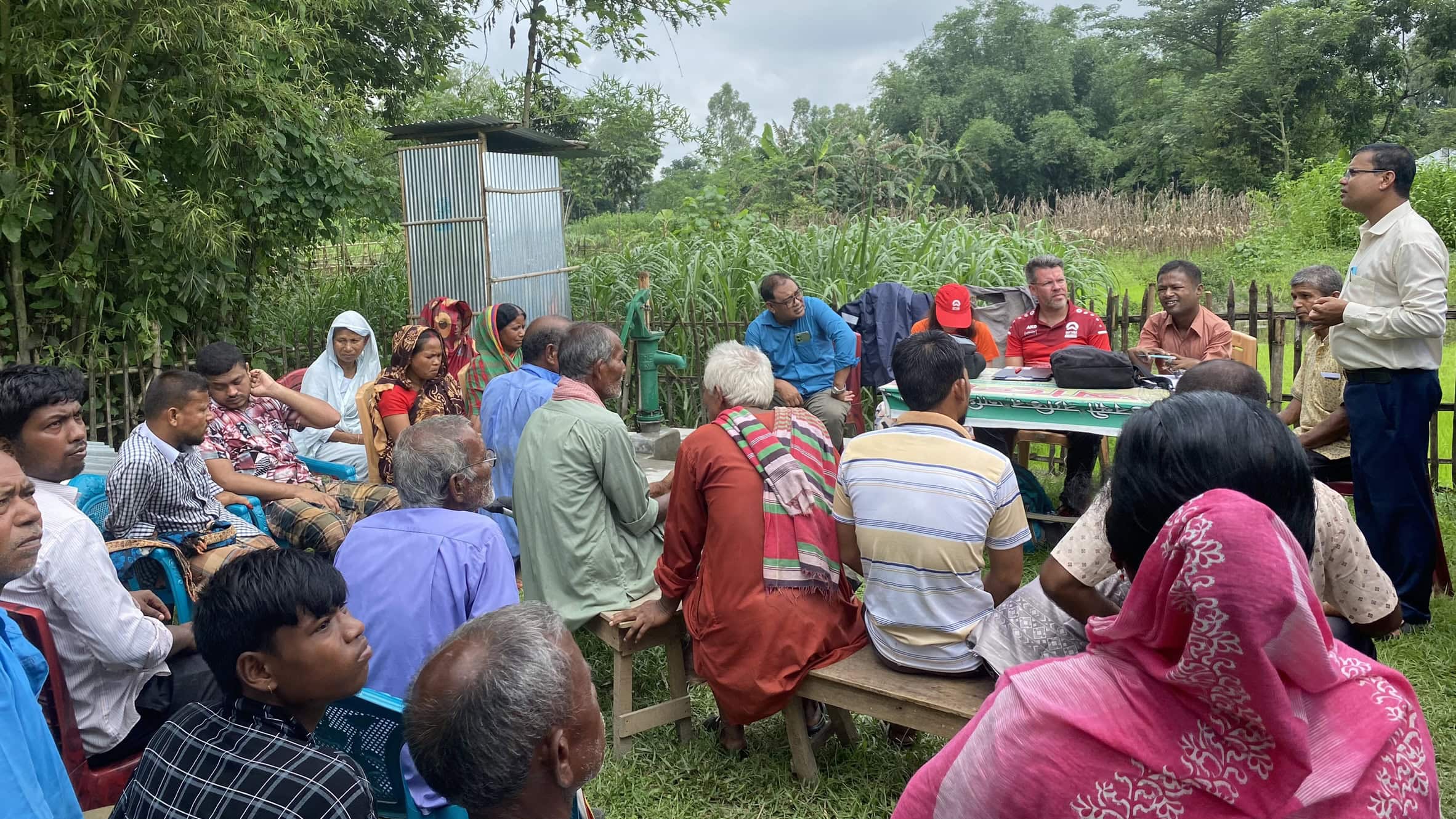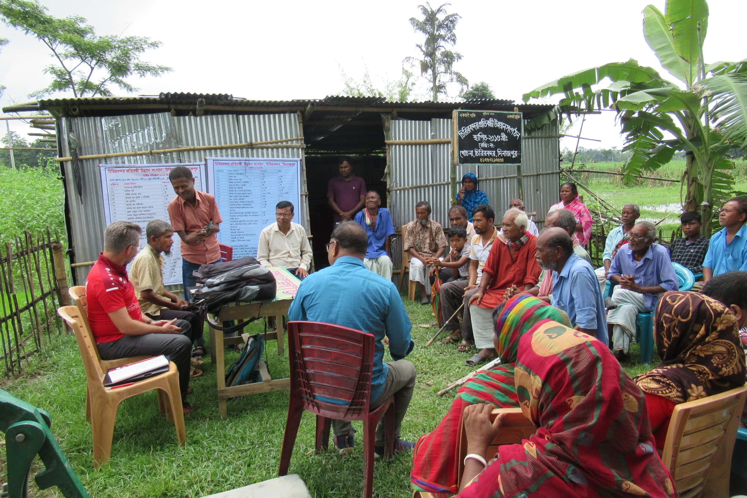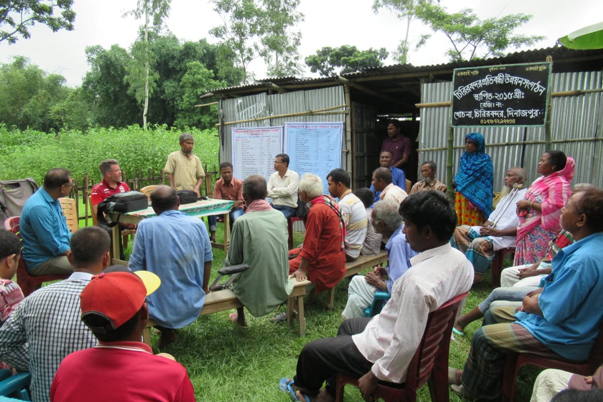 Als we aankomen in Chirirbandar, wordt er even overlegd. Gaan we binnen zitten in het kleine, golfplaten gebouw, of liever in de buitenlucht? Toch maar buiten, waar meer ruimte is voor de 35 mensen die zich verzameld hebben.