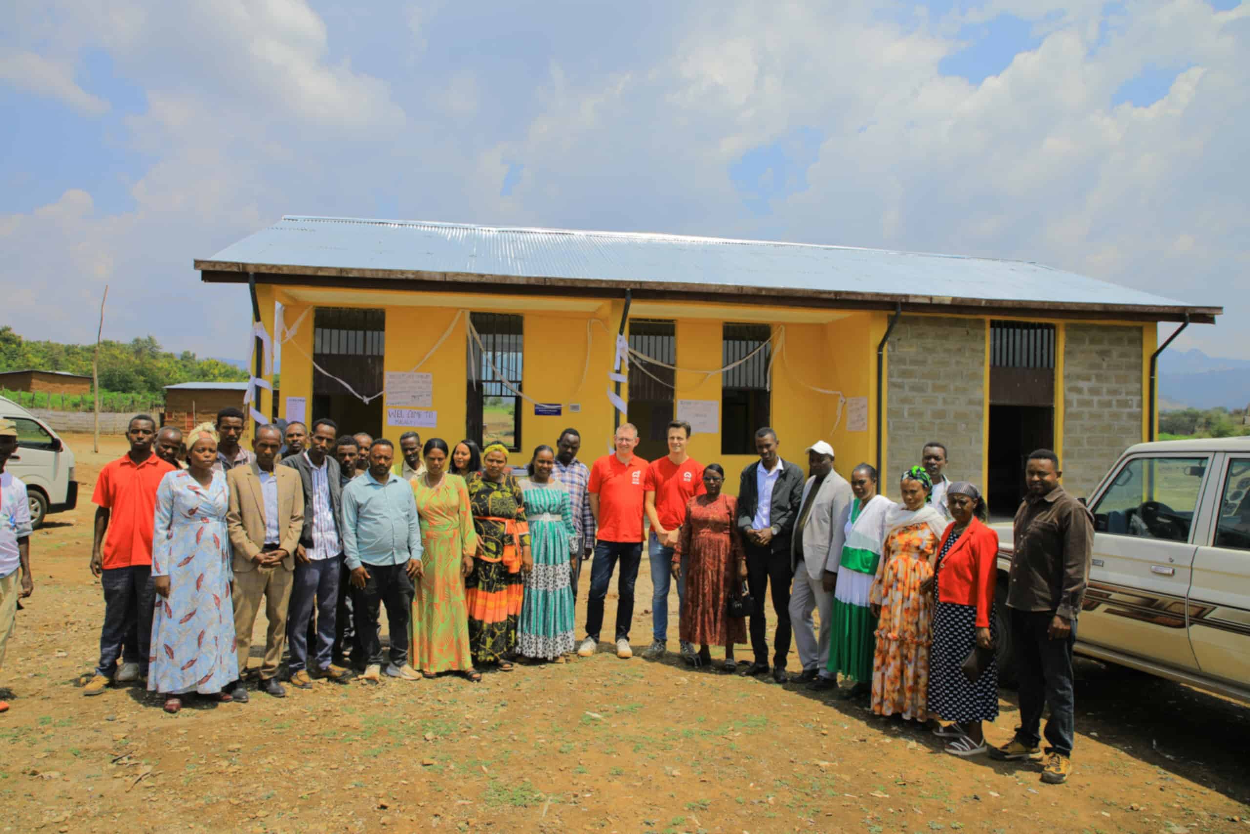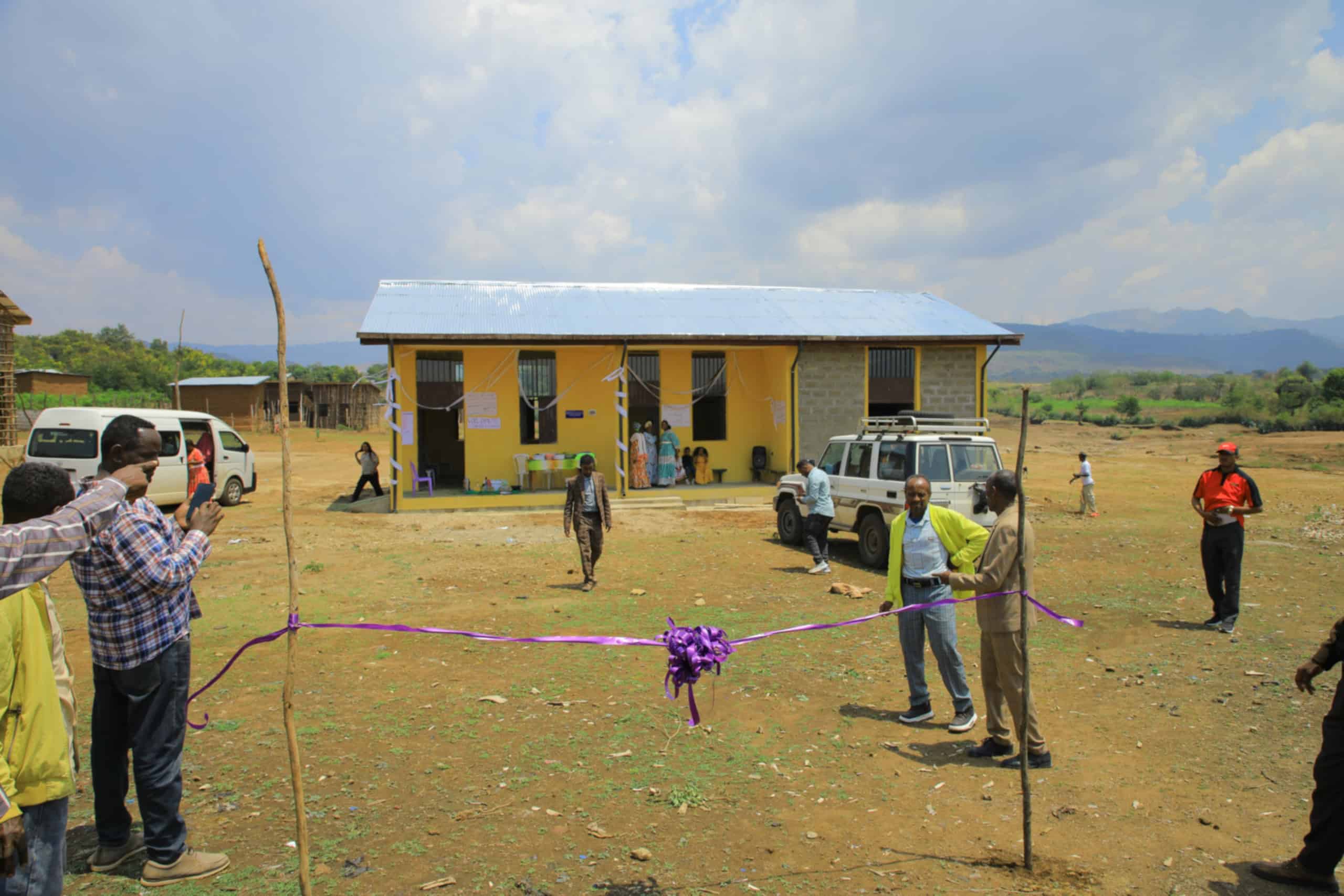 Toen we aankwamen, werden we met zang en dans verwelkomd door de lokale gemeenschap. Na een rondleiding langs de verschillende ruimtes vond de officiële opening plaats. Een paars lint tussen twee stokken werd doorgeknipt door ons samen met een vertegenwoordiger van de lokale overheid. Daarna genoten we uitgebreid van een lokale maaltijd. We kregen hartige banaan, aardappelen, zoete aardappelen en een soort wortel. Na de lunch was het tijd voor koffie, met daarbij banaan en mango.